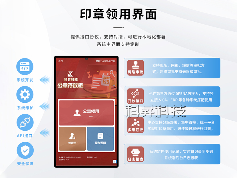 智能印章管理柜驗訖章自助存取保管柜綜合應(yīng)用物聯(lián)網(wǎng)、互聯(lián)網(wǎng)、嵌入式、生物特征識別、聯(lián)網(wǎng)通訊、數(shù)據(jù)庫、自動控制、傳感器等設(shè)計一整套完整的、定制式的驗訖章管理解決方案。