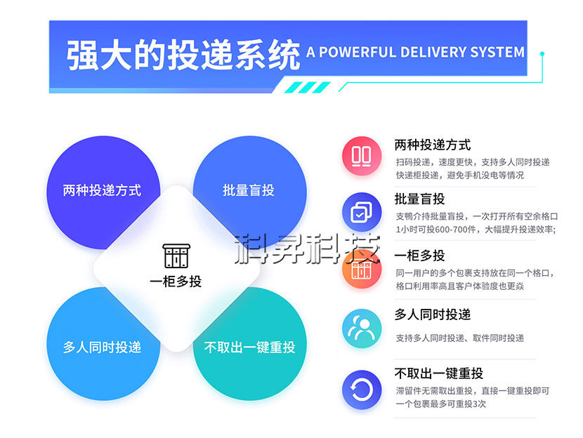 支持批量盲投、取件同時投遞、大幅提升投遞速度及格口使用率,多人同時投遞、掃碼投遞、柜體投遞、不取出直接重投、一柜多投等功能。可以提升快遞投遞速度及快遞柜格口使用率。