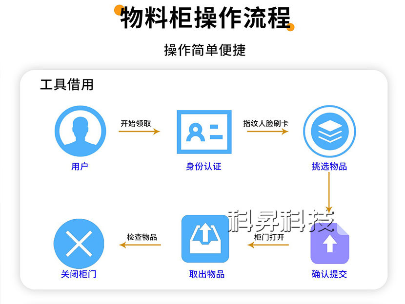屏幕點擊登陸→輸入賬號密碼/刷卡/人臉登陸→點擊工具借用→選擇領用物品→取出物品柜體掃碼物品二維碼→關閉箱門:物品領用成功