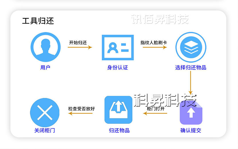 ②屏幕點擊登陸→輸入賬號密碼/刷卡/人臉登陸→點擊工具歸還→掃描借出物品二維碼→柜子打開對應箱門→放入借出物品至打卡箱門→關閉箱門:物品歸還成功
